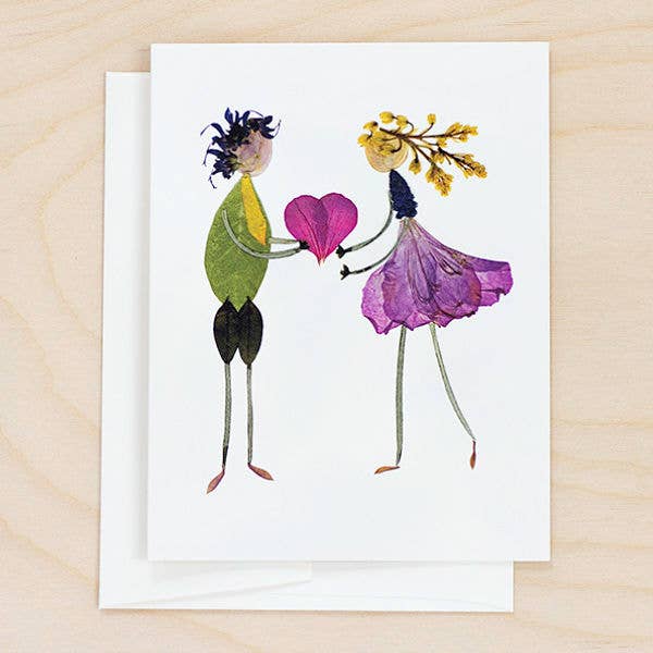 A whimsical card designed entirely from pressed flowers that I grew in my garden! Featuring the blossoms of Lily of the Valley, Azalea, Grape Hyacinth as well as herbs and leaves, this card is perfect for Valentine's Day, Wedding, Engagement or to say "I Love You."