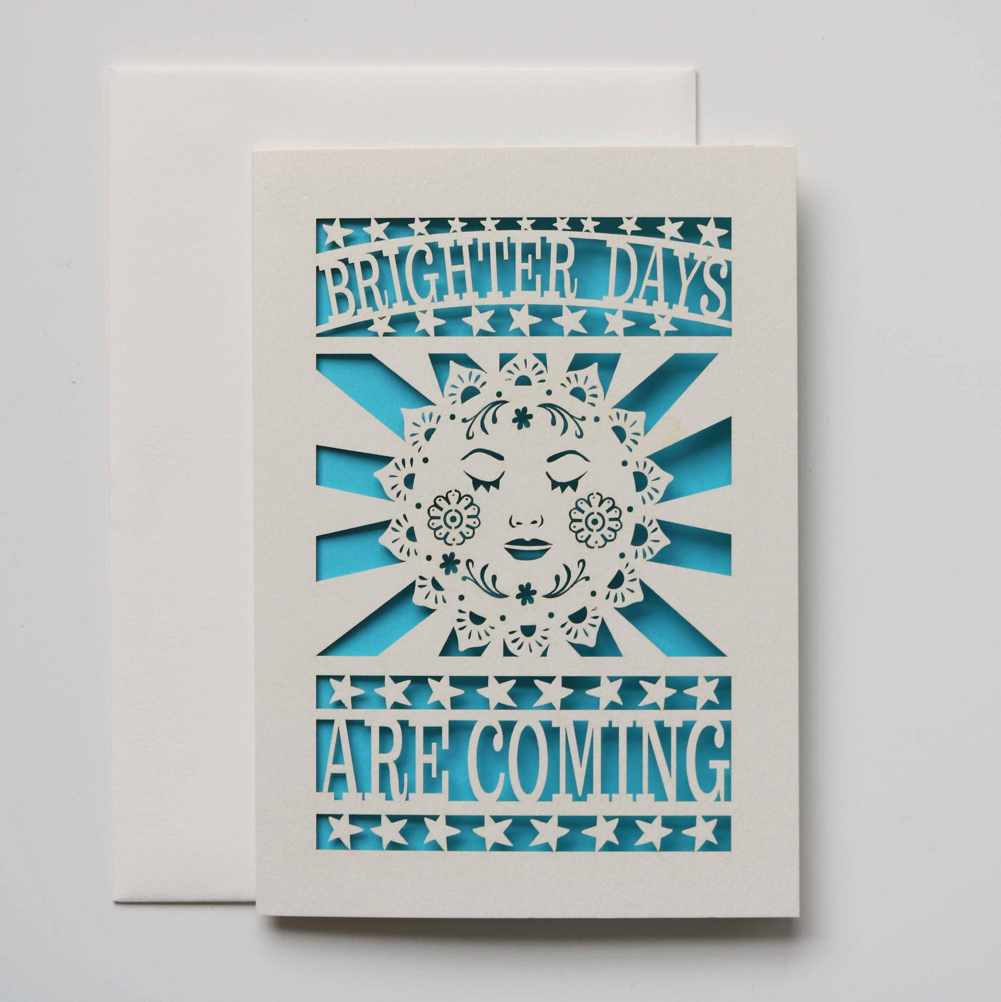 Laser cut from cream card and hand finished with a peacock blue paper insert. Cards are blank inside and packaged in a biodegradable cello bag.