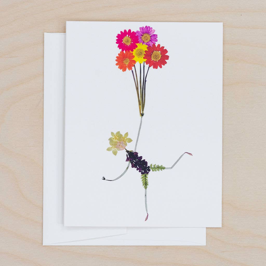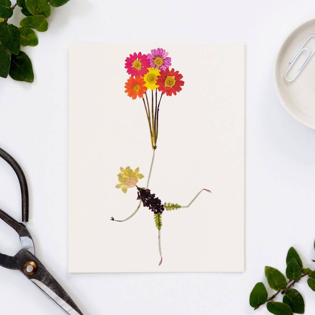 A whimsical card designed entirely from pressed flowers that I grew in my garden! Featuring the blossoms of Lilac, Bleeding Heart and Daisies, as well as ferns and herbs, this is a playful, silly card for a birthday or any balloon-worthy occasion.