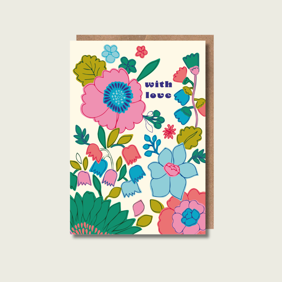 A6 greetings card. Bright & colourful, 70s floral inspired design