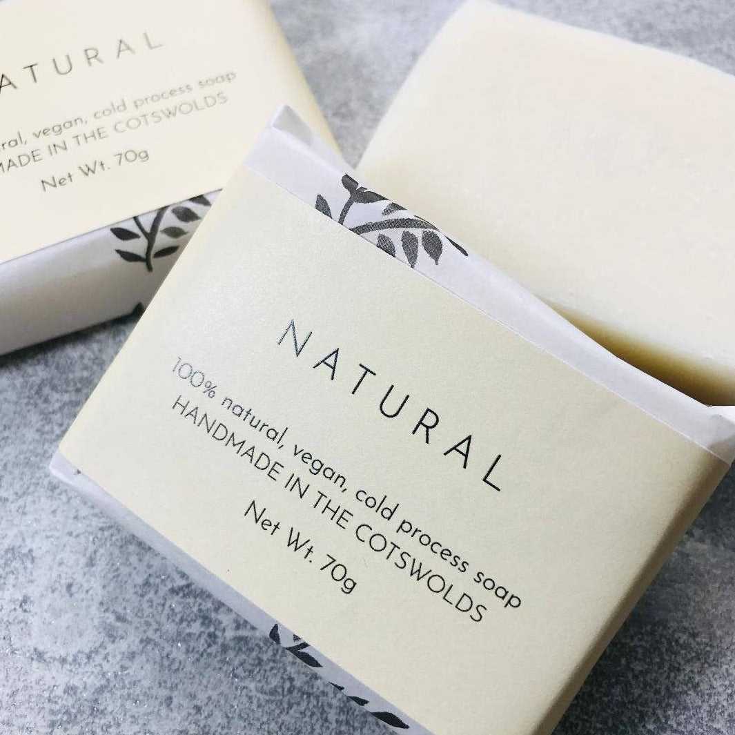 Traditionally handmade cold process soap with 100% natural ingredients. Our Natural soap is entirely plant based and vegan. With coconut oil for firmness and lather and a generous helping of shea butter to create a gentler bar.