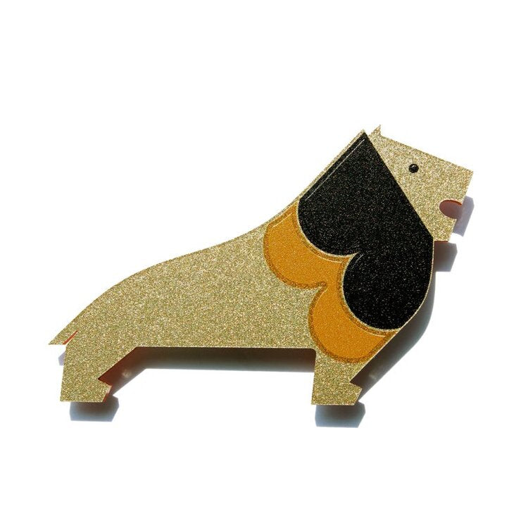 This Lion brooch is made out of shimmering gold acrylic with a striking graphic printed eye with black and yellow mustard hair and a base metal silver plated pin bar.