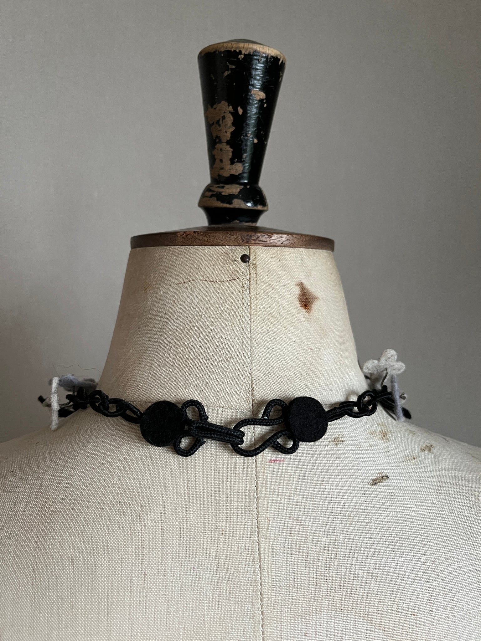 Little 100% wool felt flowers are strung through super light nylon chain to create a necklace measuring 20". The necklace is fastened at the back with a cord covered metal fastening.