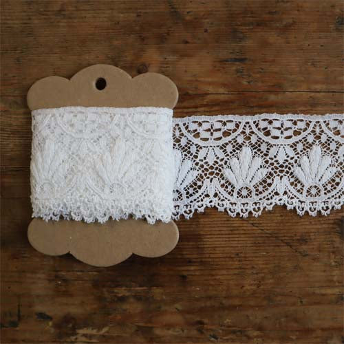 Your Nottingham Lace Trim has been hand wound onto a card bobbin with pearl pin to hold your fabric in place. Presented with a gift card.