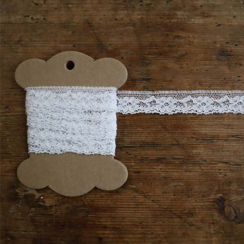 Your Nottingham Lace Trim has been hand wound onto a card bobbin with pearl pin to hold your fabric in place. Presented with a gift card.
