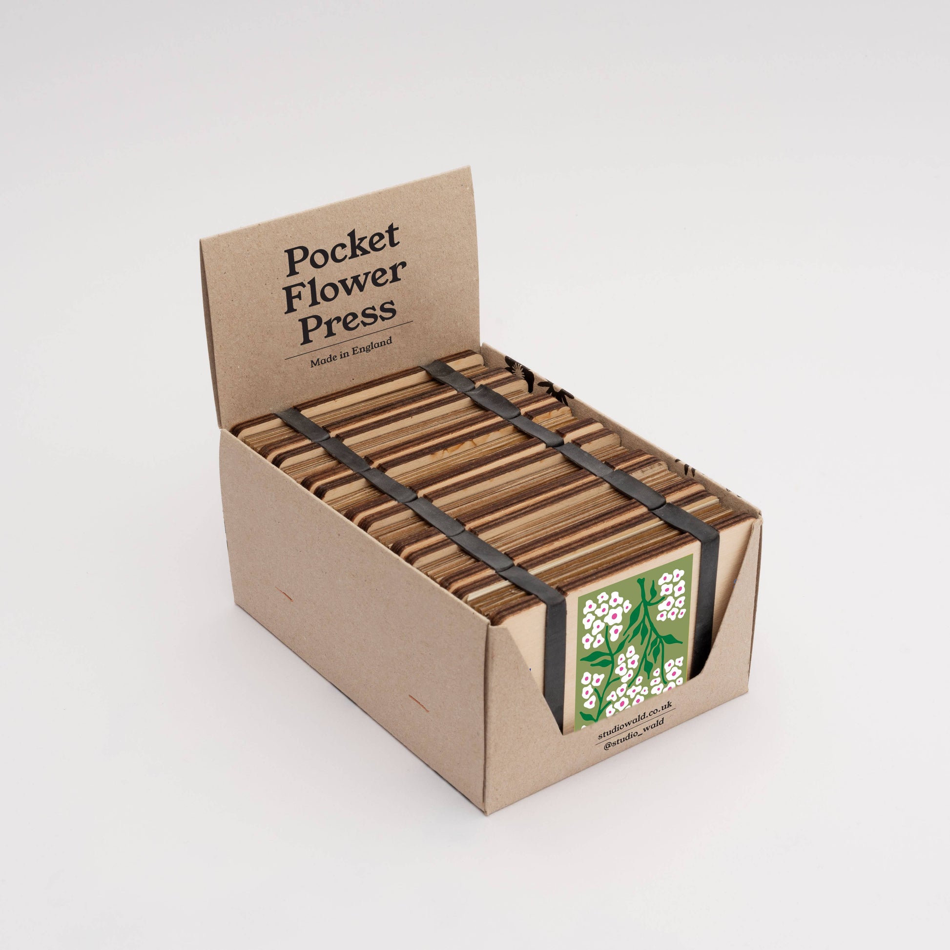 Supplied in a handy POS box containing 6 Pocket Press all of the same design. The perfect partner for collecting flora out on your wanders. Safely press your flora in the pocket press so your plant materials stay intact. Fasten using the elastic bands and pop the press in your pocket. The press comes complete with 5 sheets of corrugated card and 8 of sugar paper to give ample space to press flowers.