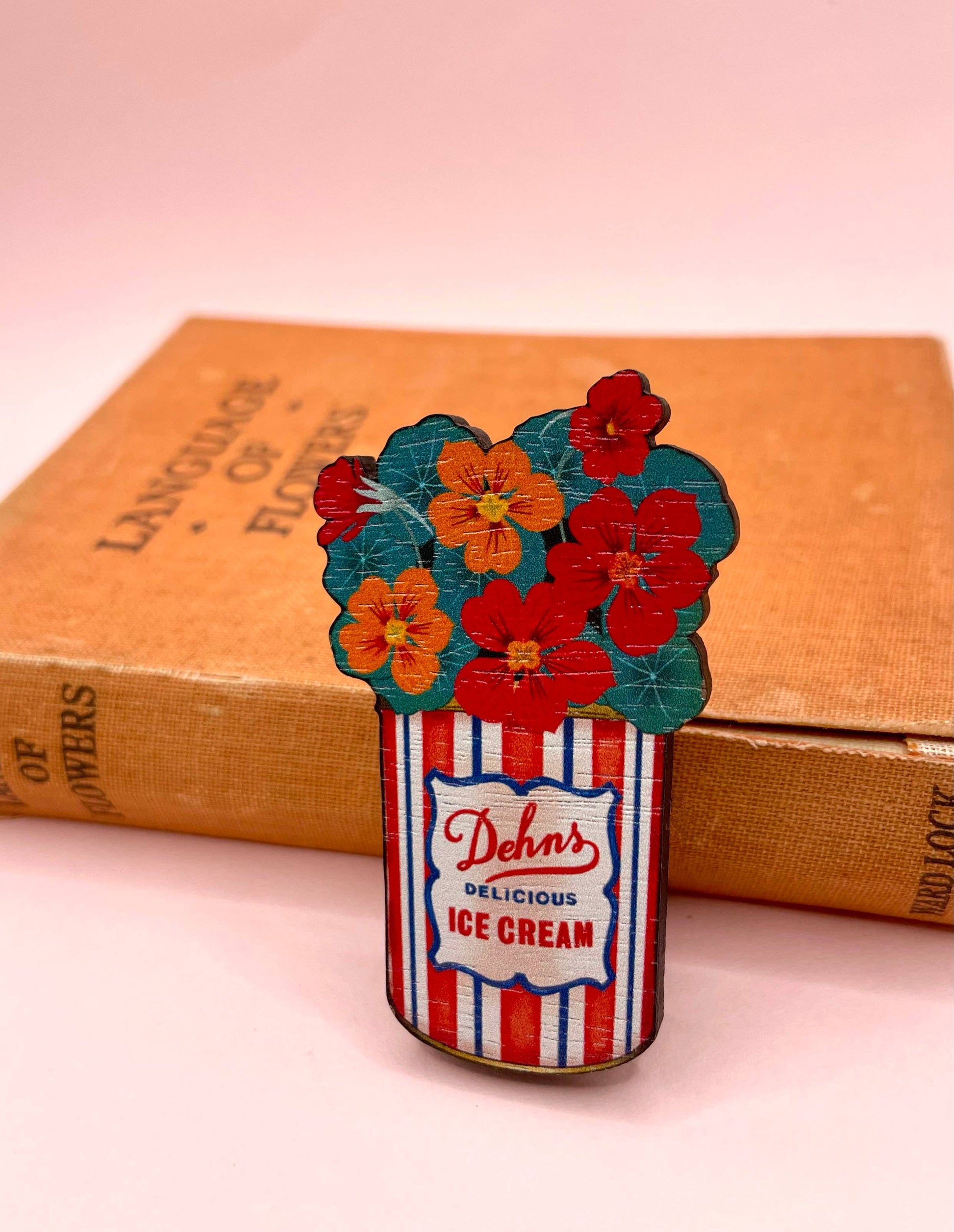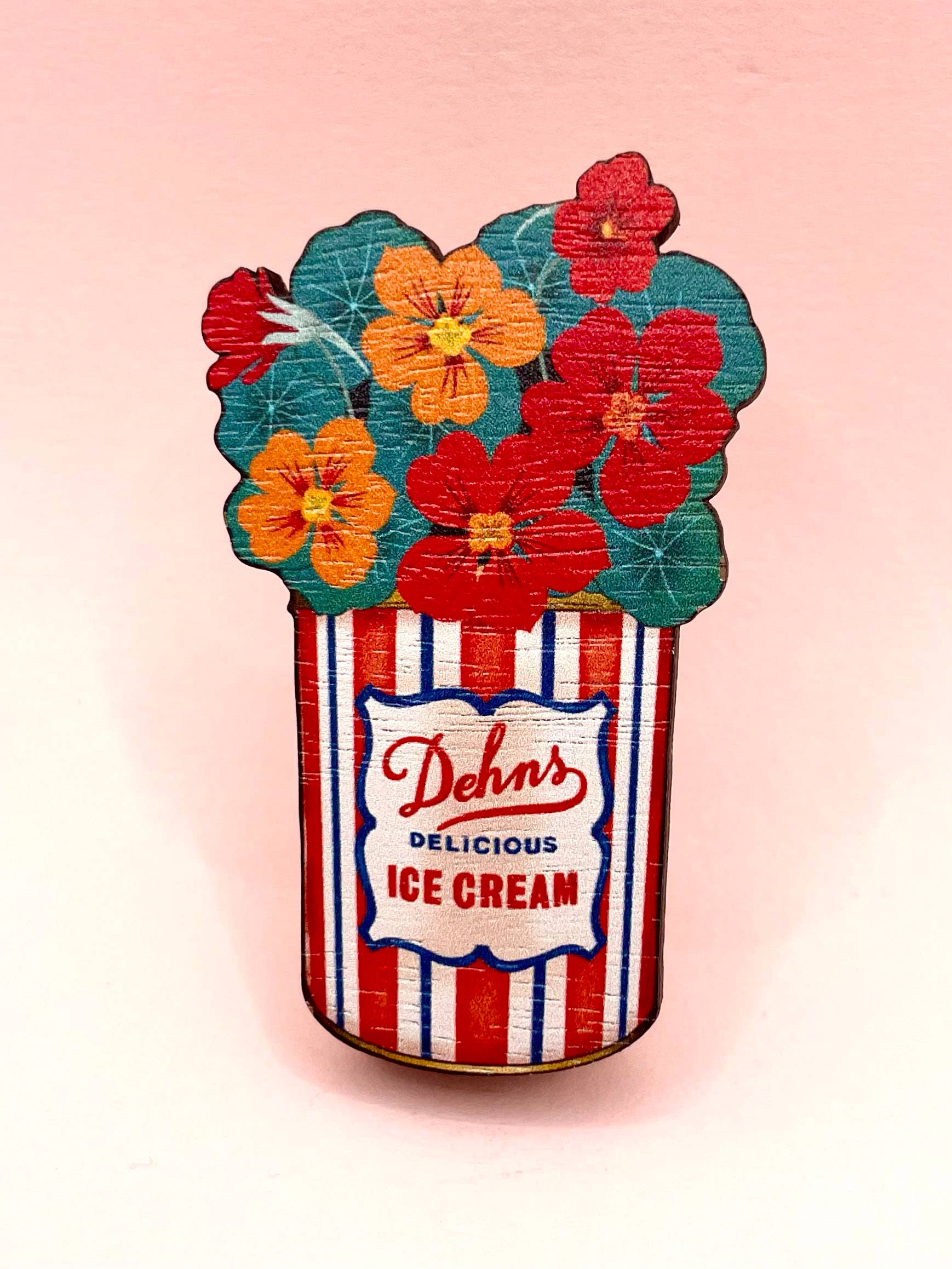 A cute wooden brooch inspired by a vintage ice cream tin filled with red and orange nasturtiums.