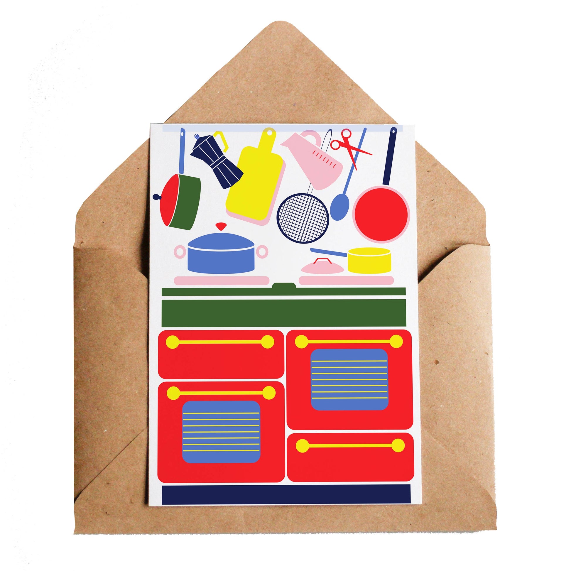 Illustrated card featuring an original kitchen design. Left blank inside for your own unique message! Comes with a recycled brown envelope, in a biodegradable cello pouch.
