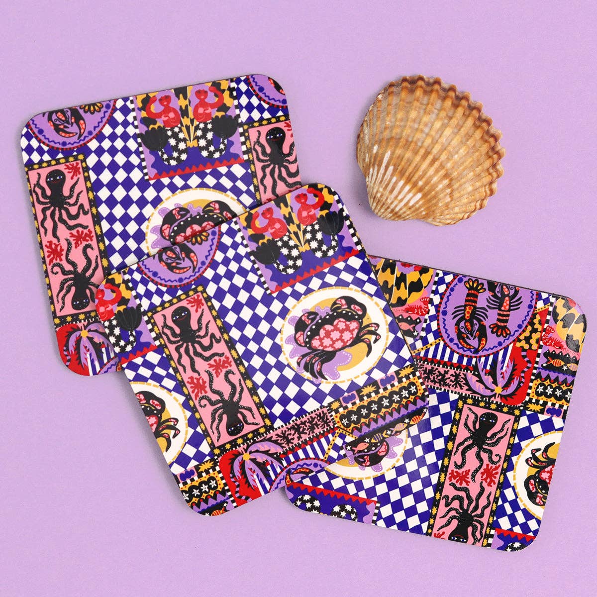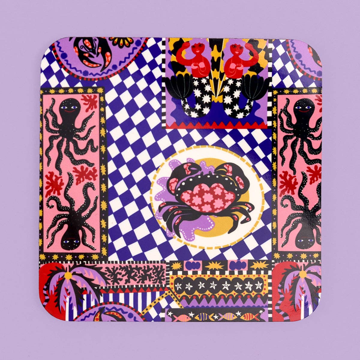 A coaster featuring a statement print by The Neighbourhood Threat. Designed and printed from our studio in Manchester. Gloss Finish. 9cm x 9cm per coaster. Wipe clean only - not dishwasher safe.