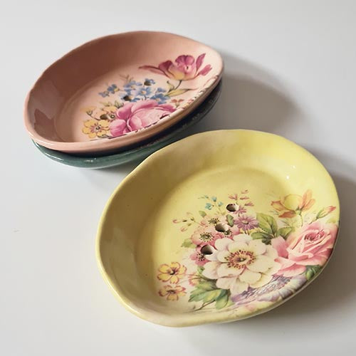 Floral transfers, metallic lustres and found objects are the finishing touches to create eclectic pieces that are precious and collectable yet ordinary and familiar."